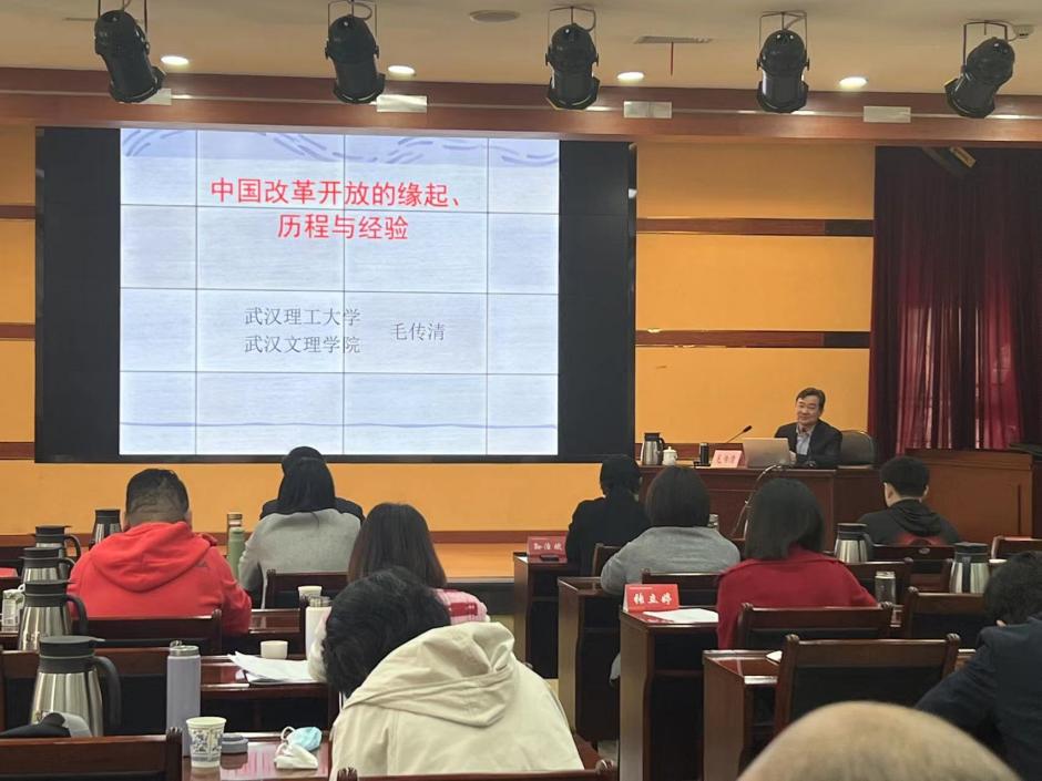 2023年3月10 日上午,公司太阳成tyc33455ccwww经理、武汉理工大学毛传清教授应邀为2023年全省民主党派中青年骨干培训班授课。毛经理以“中国改革开放的缘起、历程与经验”为题,深入讲述了改革开放的历史前提和蕴酿探索、发展历程和基本特征、巨大成就和根本原因、伟大意义和基本经验,毛经理的讲课深入浅出,生动活泼,理论联系实际,材料数据丰富,既有思想高度和理论深度,又有很强的针对性和感染力,受到民主党派中青年骨干培训班学员的欢迎和承办方湖北省社会主义公司领导的高度评价。