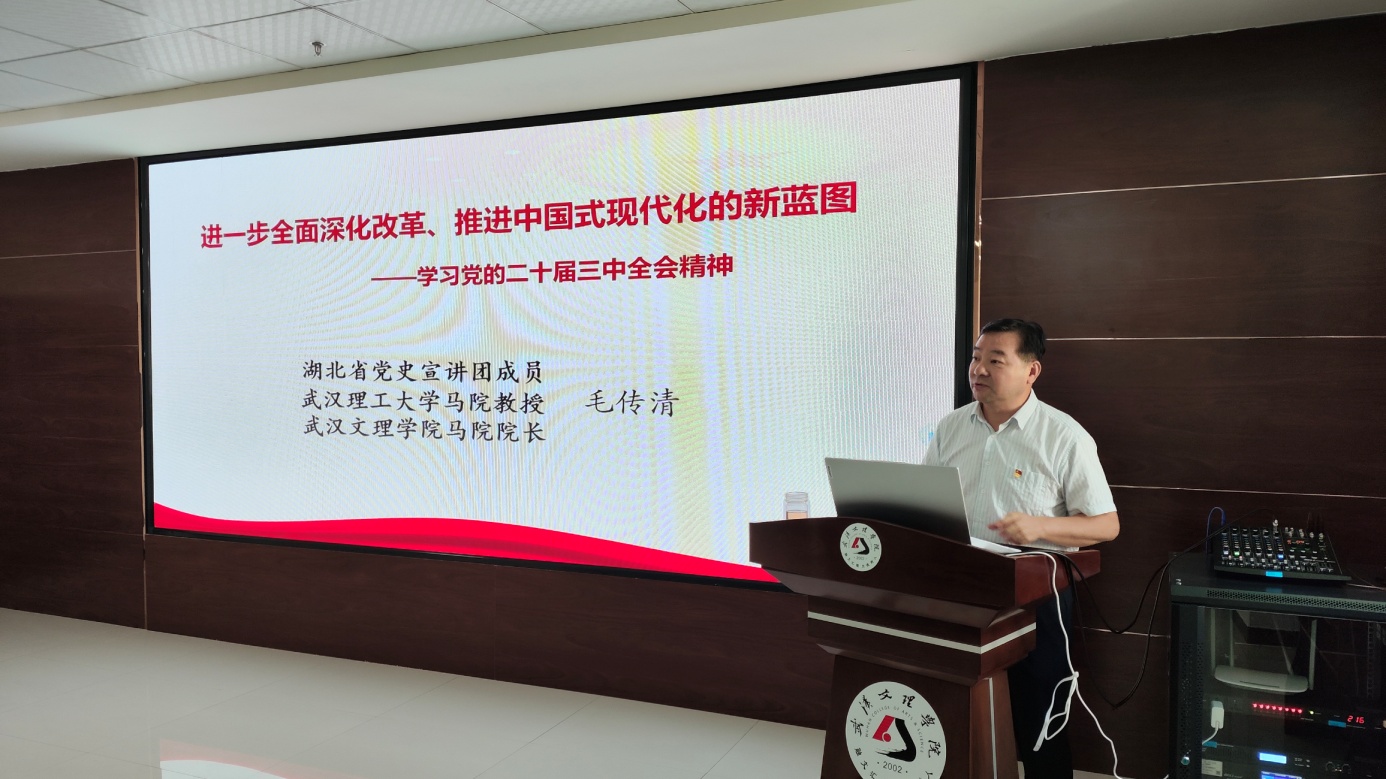 公司经理毛传清作领学重点发言。他以《进一步全面深化改革,推进中国式现代化》为题,从改革成为历届三中全会的主题、党的二十届三中全会的重大意义、中国式现代化对进一步全面深化改革提出新要求、进一步全面深化改革的总体思路和系统部署、进一步全面深化经济体制改革的重点方面等五个方面做了专题解读。他提到,此次全会是在新时代新征程上,中国共产党坚定不移高举改革开放旗帜、紧紧围绕推进中国式现代化进一步全面深化改革召开的一次十分重要的会议,承载着深远的国家战略考量。在当前科技革命迅猛发展的重要战略机遇期,我们必须适应时代变化和需求,不断开创中国式现代化新局面。他还解读了构建高水平社会主义市场经济体制、建设更高水平开放型经济新体制、推进教育科技人才体制机制一体改革、坚持党的领导等重点内容。
